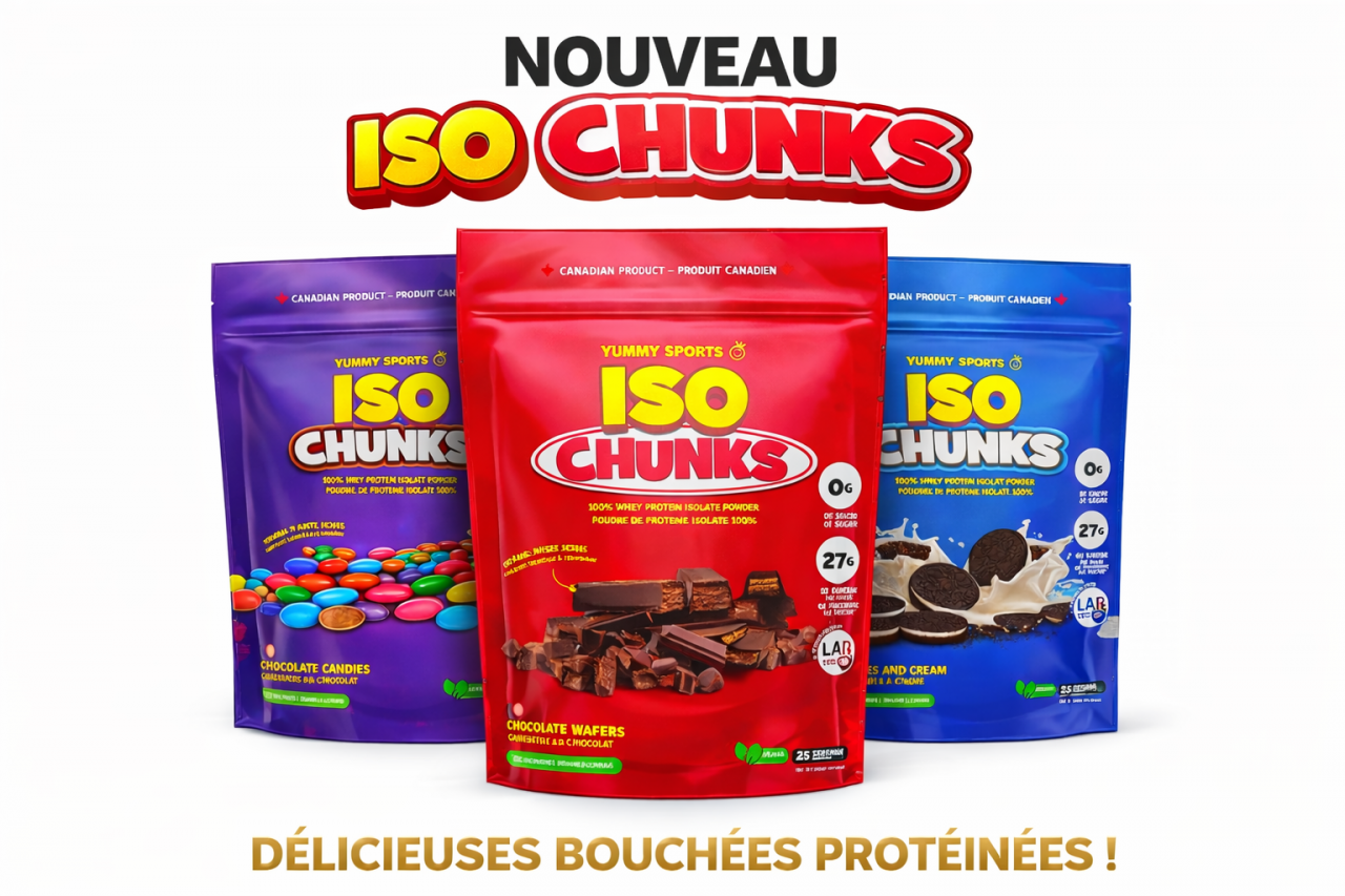 La ISO Chunks de Yummy Sports est enfin là ! Une protéine 100 % isolat, réduite en calories, en gras et en sucre, avec l'ajout de véritables morceaux de vos friandises préférées.